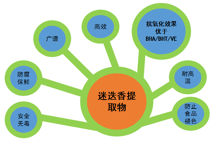 因此在食品補充劑、食品飲料、鮮肉、面館甚至調味品等領域都能發揮其天然防腐抗氧化作用。被譽為世界公認的第三代綠色食品抗氧化劑。